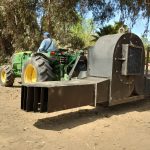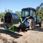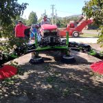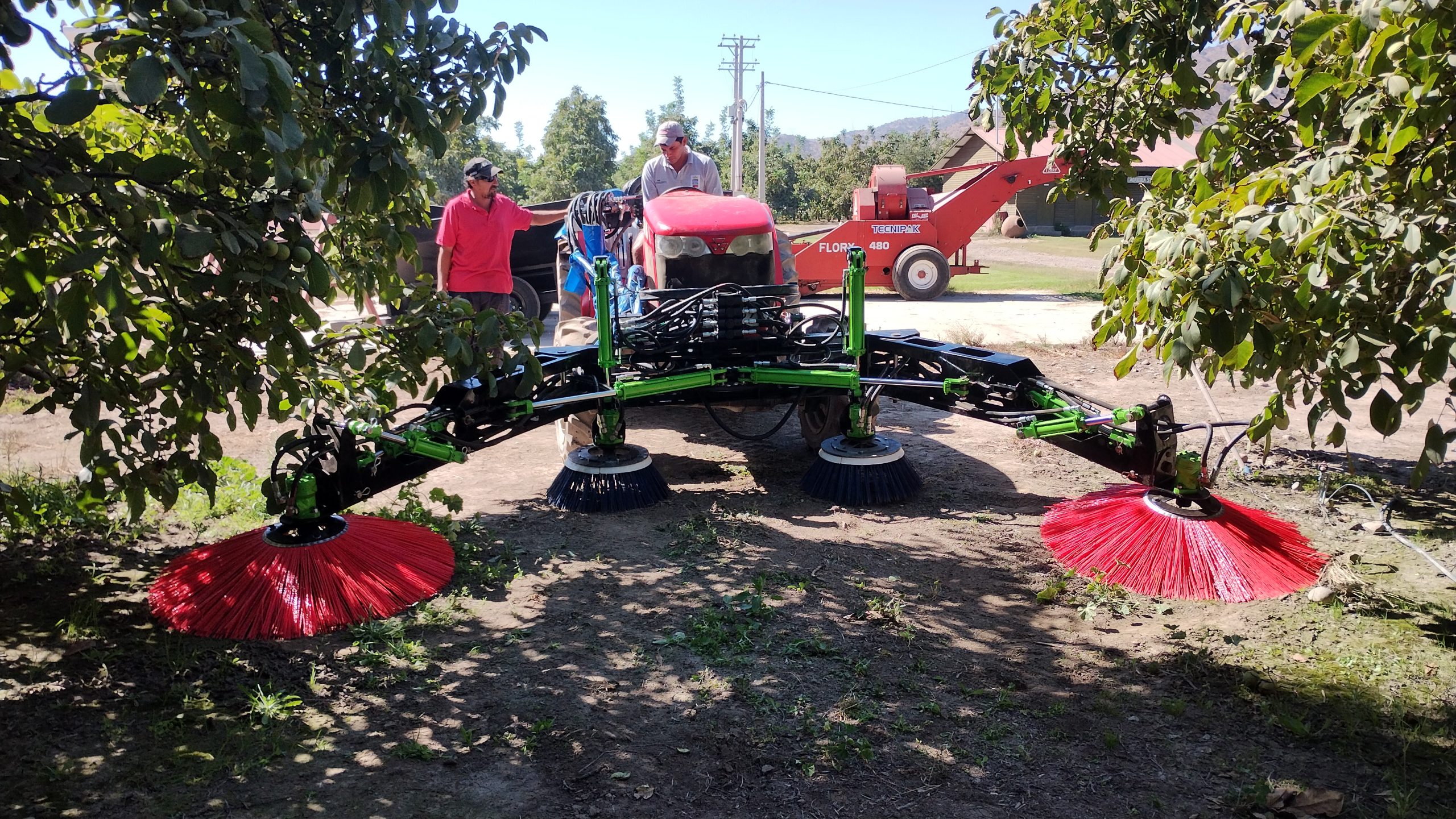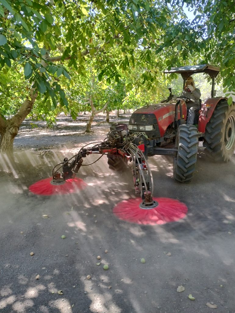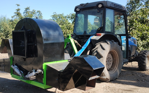 Apoyados por un soplador de aire conectado al PTO de salida del tractor, logramos desplazar los frutos secos ubicados bajo el árbol a la hilera siguiente. Pueden tener más usos, como la limpieza de hojas y sarmientos para favorecer el tratamiento con herbicidas; y también, para el secado de hojas después de una lluvia.